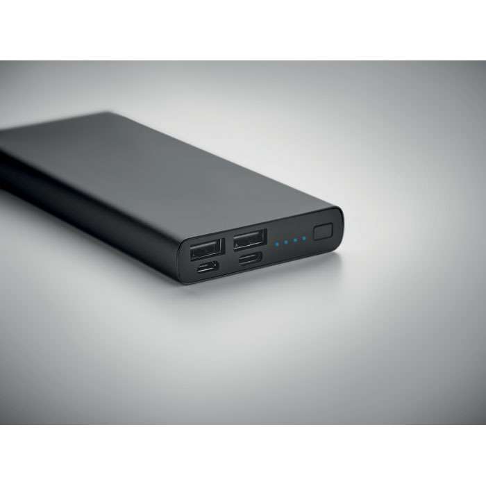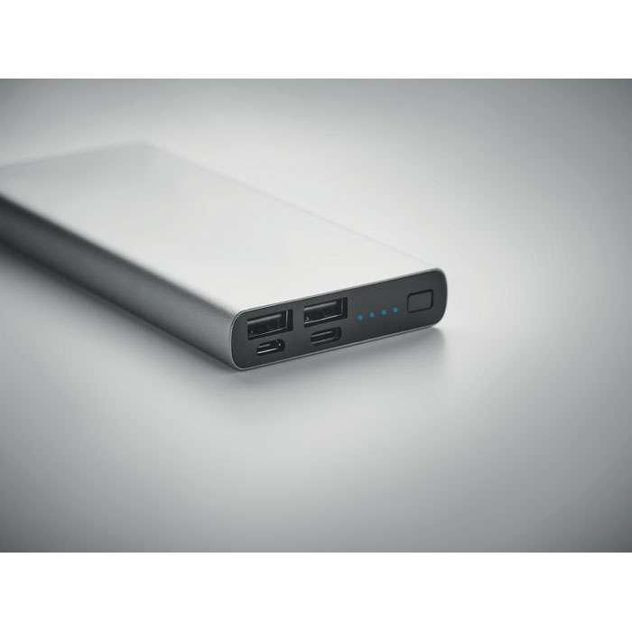 Powerbank 10000 mAh i aluminium. Lämplig för för smarttelefoner. Uteffekt: DC5V/1A och DC5V/2A . Laddindikeringslampa och USB-kabel med micro usb-kontakt. Stödjer snabbladdningsteknik (18W). In/utgång: Typ-C kontakt.
