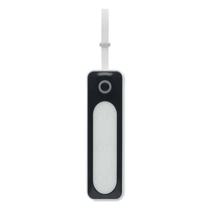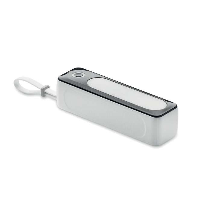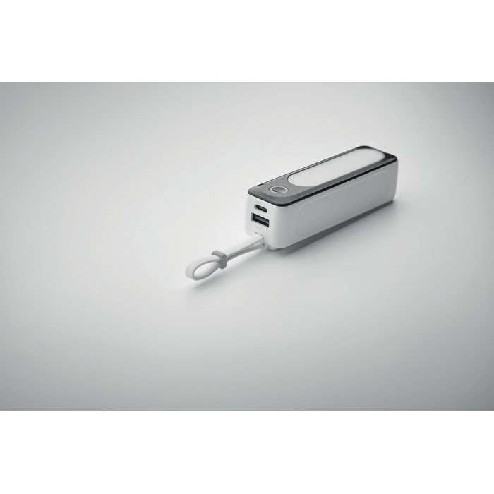 Powerbank 5000 mAh kapacitet i ABS-hölje. Utgångsström DC5V/2A. Inkluderar indikering med 4 ljusinställningar (6 COB led) och integrerad USB-kabel med typ C-kontakt.