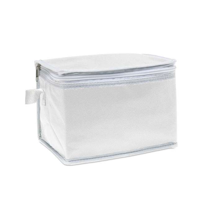 Kylväska för 6 st 33 cl burkar. Utsidan i non-woven med vit dekor. 80 gr/m². Isoleringsmaterial: Skumfoder laminerad med aluminium folie. Volym 3L.
