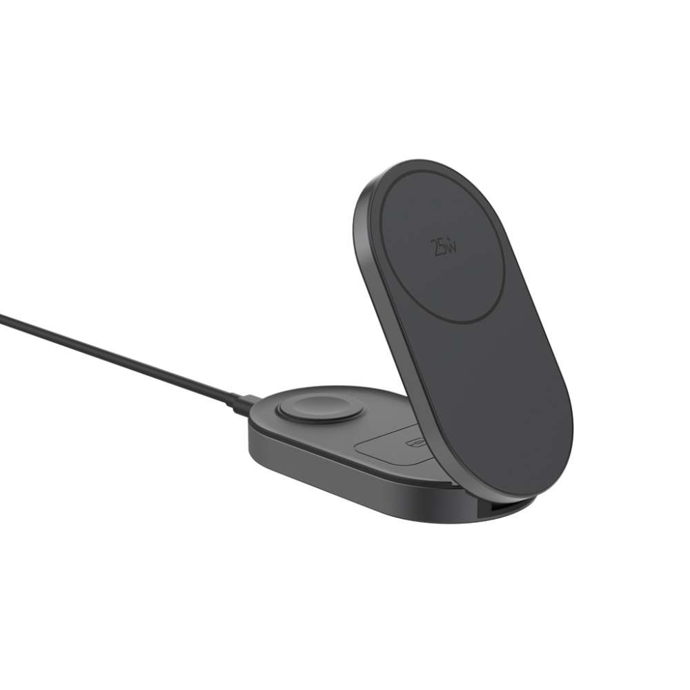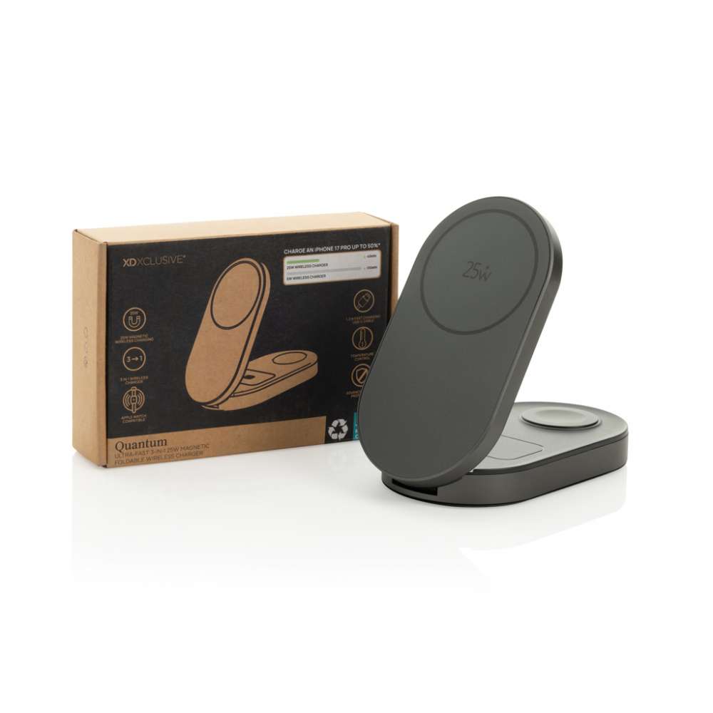 Upplev ultrasnabb magnetisk trådlös laddning på 25 W med Quantom ultrasnabb 3-i-1. Den hopfällbara laddningslösningen är utformad för att ladda din mobil, Apple Watch och dina hörlurar samtidigt. Det högpresterande systemet säkerställer stabil och effektiv laddning för alla tre enheter, medan avancerade säkerhets- och temeraturskydd ger trygg och pålitlig användning.Den hopfällbara designen gör laddaren extra kompakt och idealisk för resor, med kraftfull prestanda var du än befinner dig. Tillverkad av RCS-cert återvunnen ABS-plast. RCS (Recycled Claim Standard) är en standard som verifierar återvunnet innehåll i en produkt genom hela leveranskedjan. Totalt återvunnet innehåll: 51% baserat på produktens totala vikt.USB-C-ingången säkerställer jämn energitillförsel för optimal uteffekt på 25 W. Produkten och tillbehören är PVC-fria och förpackade i FSC® mix kraftförpackning. En 120 cm USB-C till USB-C-kabel av RCS-cert återvunnen TPE ingår. Minsta ingång: 9V/3A för optimal användning