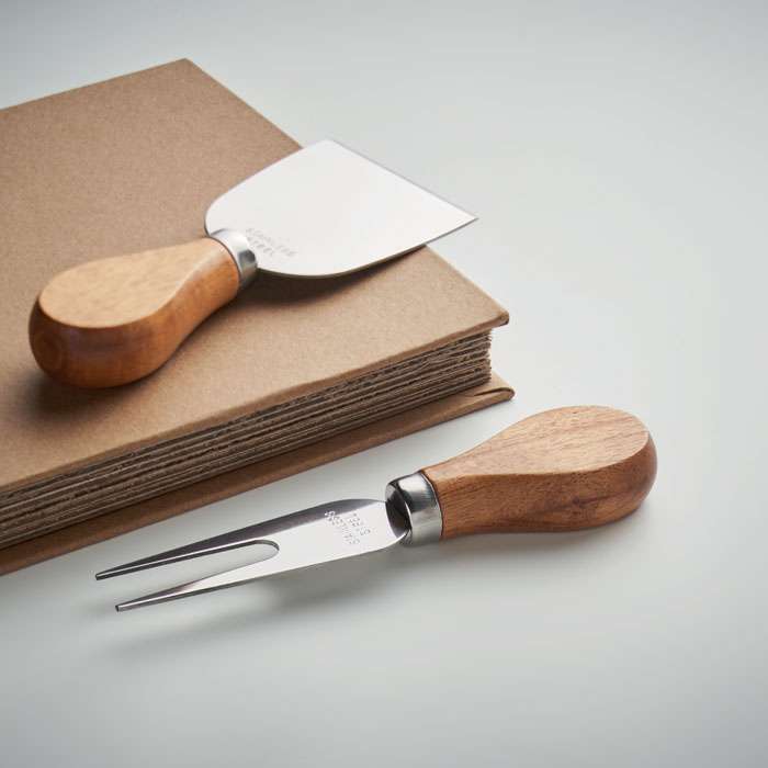 Set med 4 ostknivar i rostfritt stål och handtag i gummiträ. Presenteras i en presentförpackning av wellpappkartong.