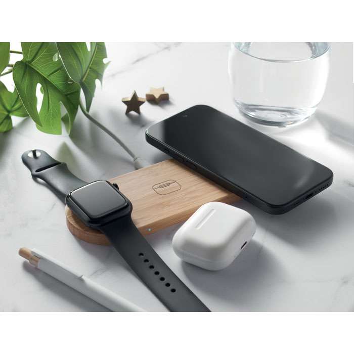 3 i 1 laddningsstation i bambufodral. Den innehåller en trådlös laddare 15W, smartwatch-laddare (endast Apple®) och TWS laddare. Bambu är ett naturmaterial och resultatet av laser kan därför skilja mellan exemplaren.