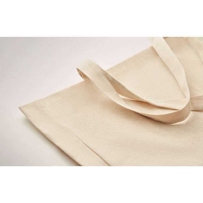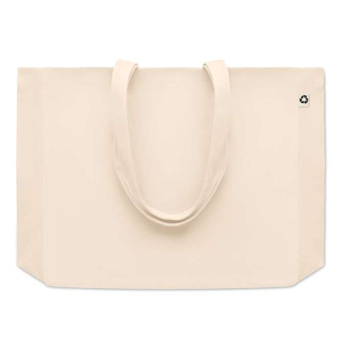 Tygkasse eller strandväska i naturfärgad canvas gjord av 50% bomull och 50% återvunnen bomull. Långa handtag och bälg. Kvalite: 280gr/m².
