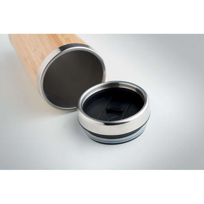 Termosmugg i rostfritt stål med utsida i Bambu. Dubbla väggar för bättre värmeisolering. Fungerar för både varma och kalla drycker. Volym: 400ml.