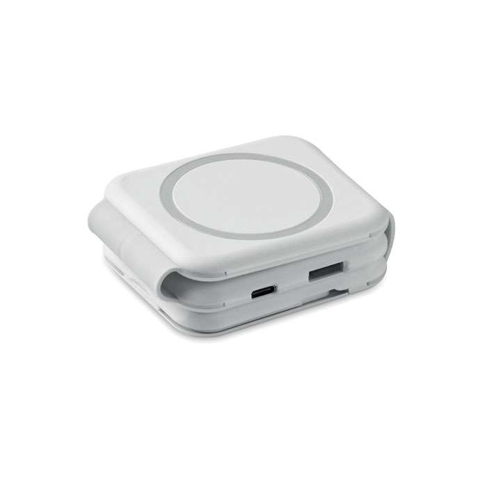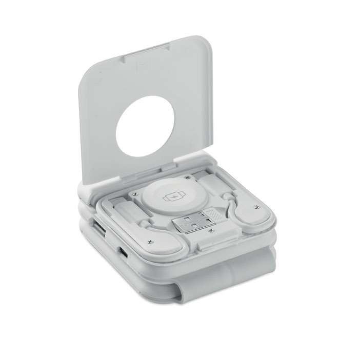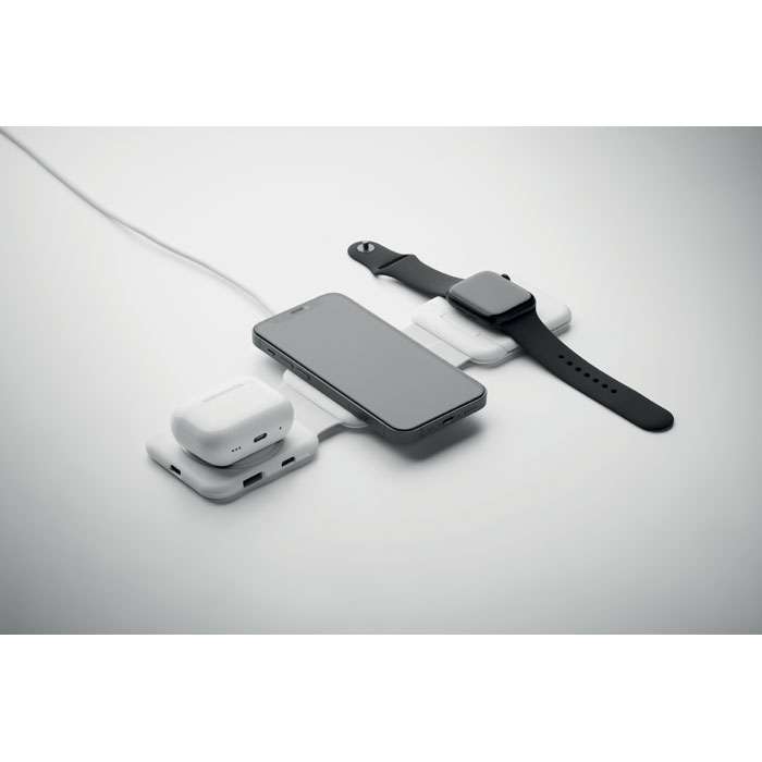 Magnetisk laddningsstation i ABS. 3 platser för trådlös laddning. 1 x 15W, 1 x 5W för TWS och 1 Apple watch-laddare (3W). 2 Typ-C & 2 USB-A HUBS. Integrerad kabelingång: kontakt från typ C till USB-A.
