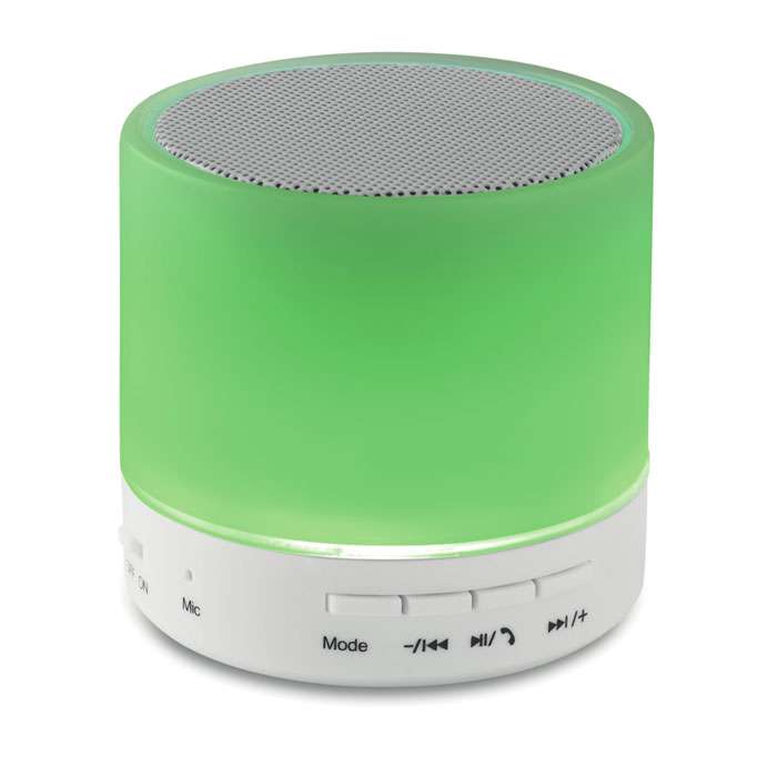 Trådlös högtalare med trådlös i ABS plast. Inbyggd LED lampa som skiftar ljus i 3 olika färger. Laddningsbar med ett inbyggt 500 mAh Li-ion batteri. SD-kortport och AUX/USB kabel. Handsfree med ring och svara funktion. Output: 3W, 4 Ohm. Speltid ca 2 timmar på en laddning.