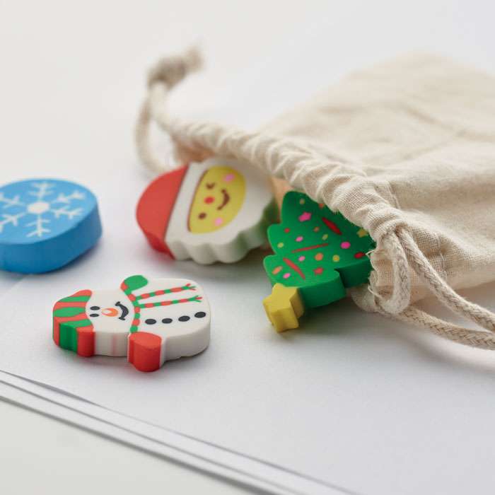 Set med 4 olika suddigummi med julmotiv: snöflinga, tomte, julgran och snögubbe. Presenteras i en väska med dragsko i bomull.