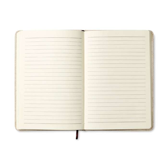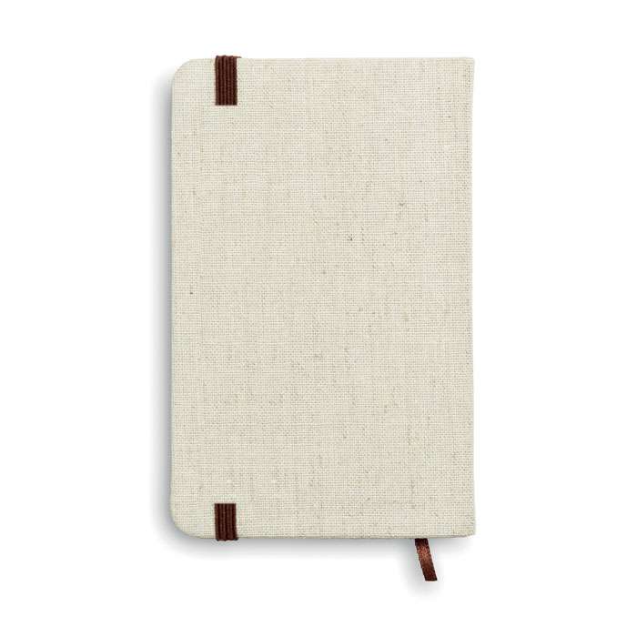 A6 notebook with hard canvas cover. Casebound. 192 lined pages (96 sheets). Contrasting elastic closure strap and ribbon page-marker.