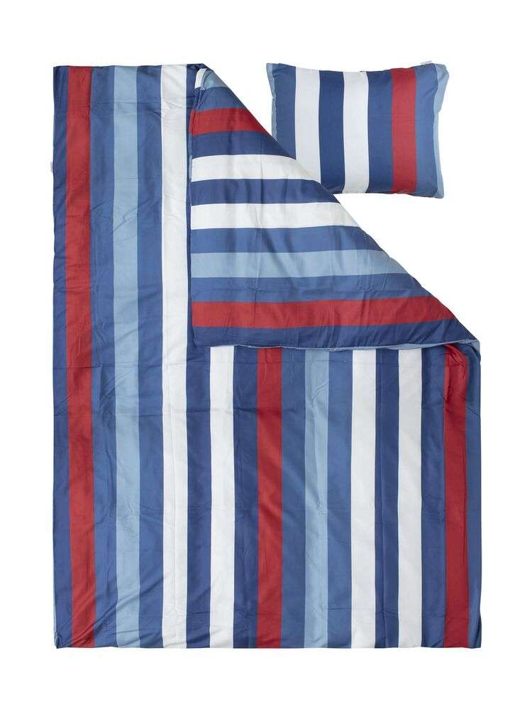 Bäddset i snabbtorkande mikrofiber i marint bredrandigt mönster på vit botten.
