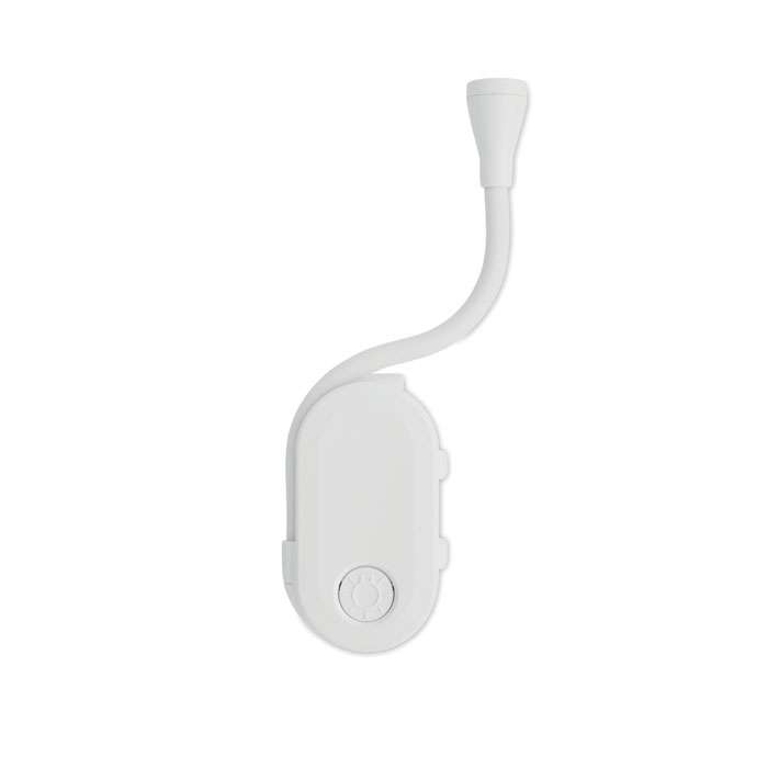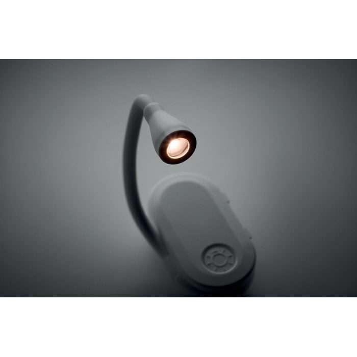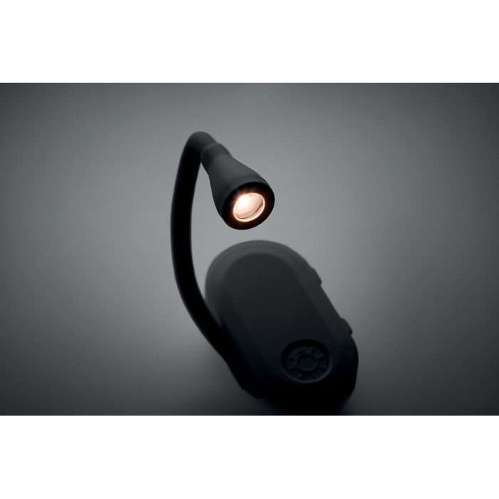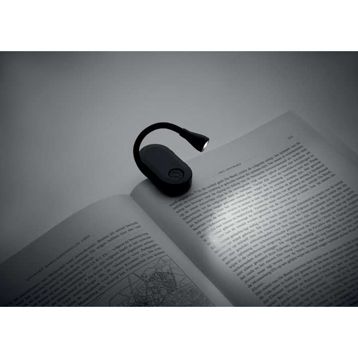 Uppladdningsbar LED-boklampa i ABS med flexibel kropp och klämma. Har 3 ljusinställningar, 300mAh batteri.