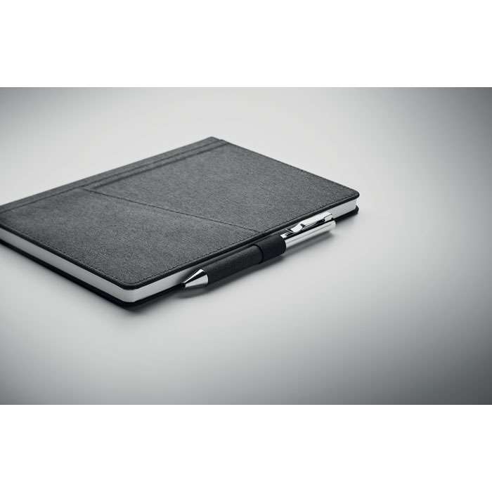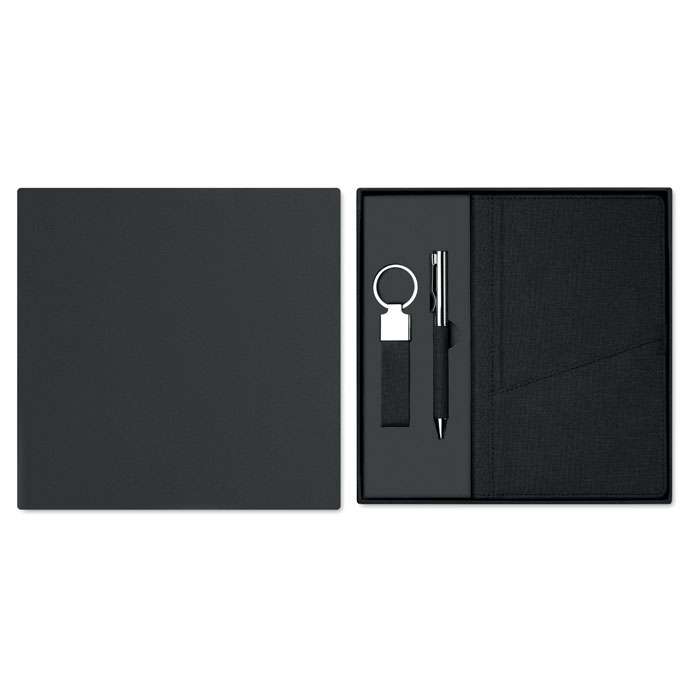 3-delad presentset. Innehåller kulspetspenna med vidfunktion i metall och RPET polyesterdetaljer, RPET anteckningsbok med hårt omslag och smartphoneficka på framsidan samt nyckelring i RPET polyester. Blått bläck.