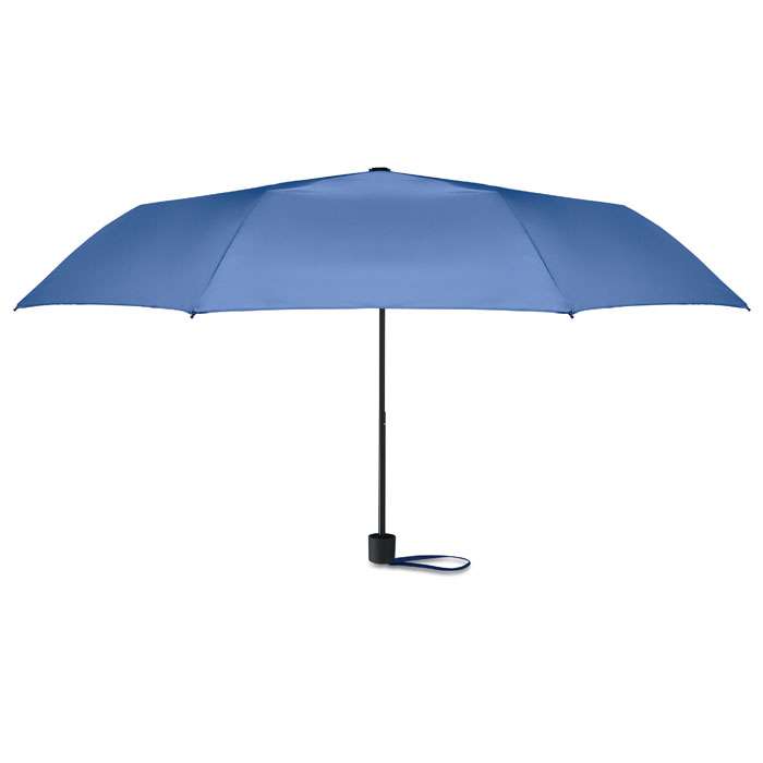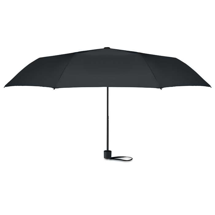 21 tum 3-delat paraply med manuellt öppnings- och stängningsbart, stormsäkert i 190T RPET pongee inklusive tygväska. Har ett dolt blixtlåsförsett fack för paraplyet och för att hålla väskans innehåll torrt. När väskan inte används rullas den ihop och blixtlåsfacket fungerar som paraplyfodral.