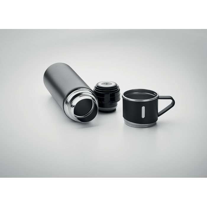 Set med dubbelväggig vakuumisolerad kolv i rostfritt stål med läckagefritt lock och 2 extra koppar. Kapacitet: kolv – 420 ml, kopp – 150 ml.