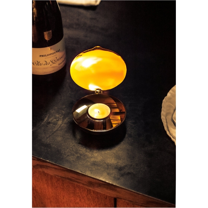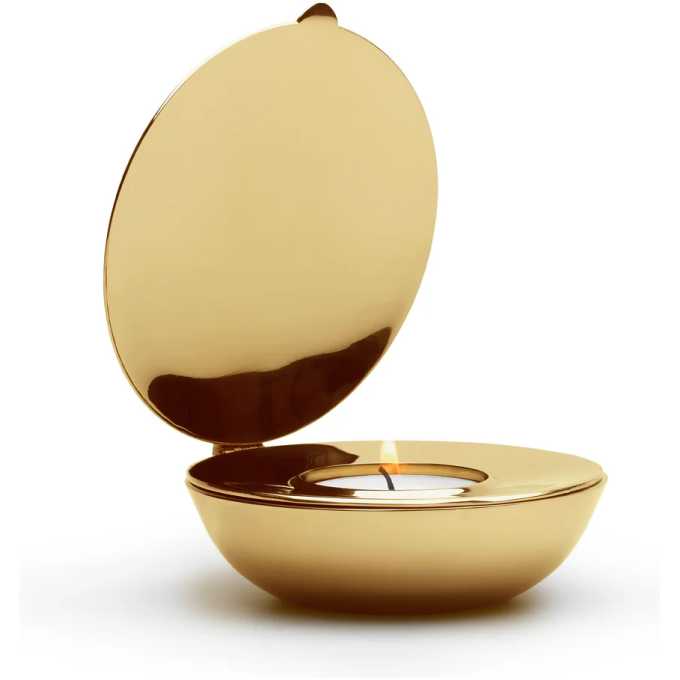 Ljushållare inspirerad av äldre dagars vägglampetter. Lågan reflekteras i locket och sprider ett härligt varmt sken i rummet. Designad av Magnus Löfgren.