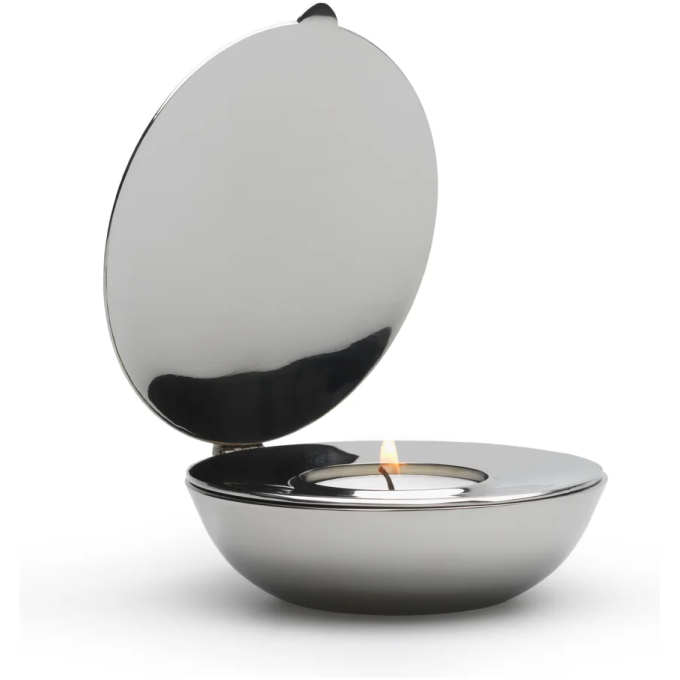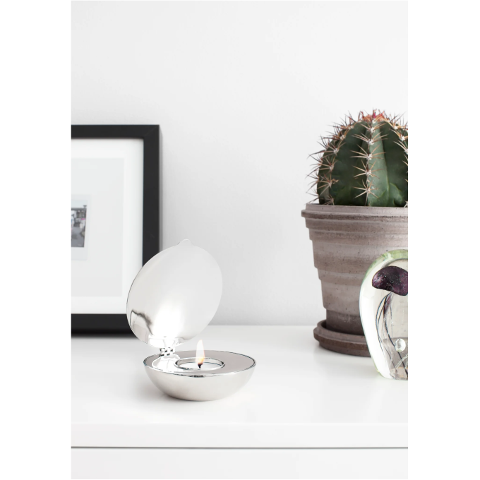 Ljushållare inspirerad av äldre dagars vägglampetter. Lågan reflekteras i locket och sprider ett härligt varmt sken i rummet. Designad av Magnus Löfgren.