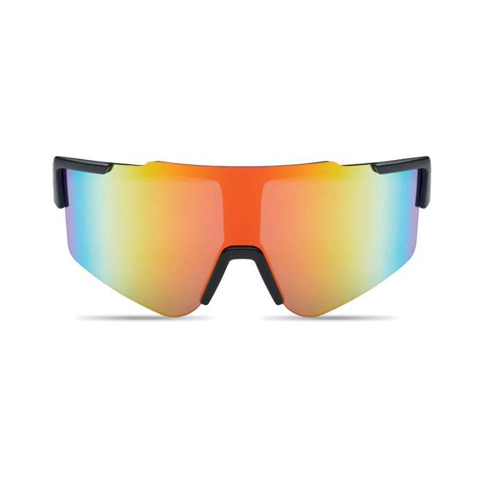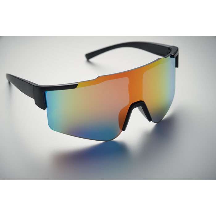 Sportsolglasögon med spegelglas och svart båge. UV400-skydd.