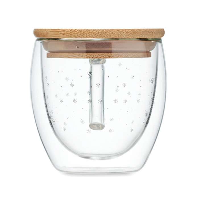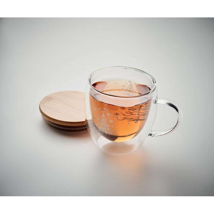 Dubbelväggig borosilikatmugg med träddesign och bambulock. Kapacitet: 220 ml.