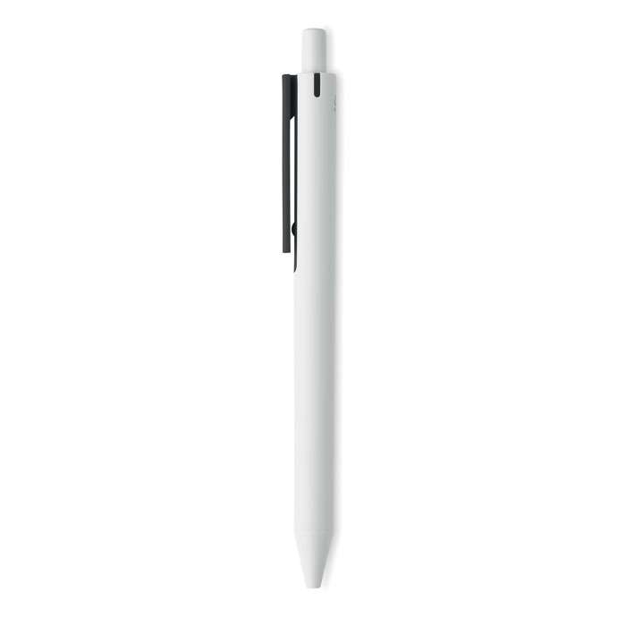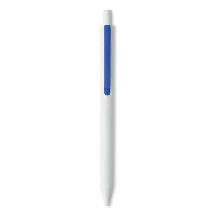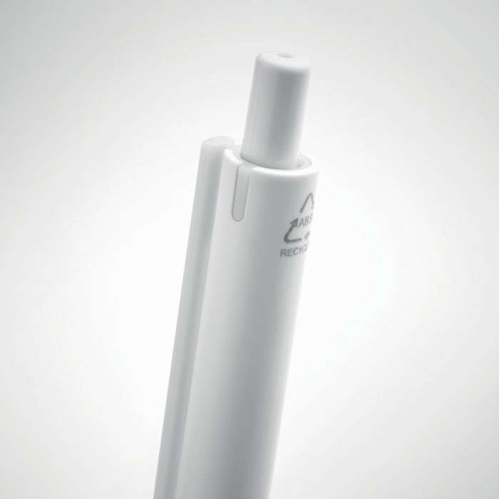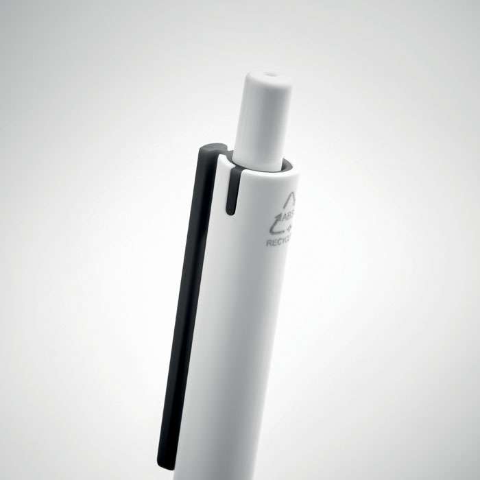 Kulspetspenna med tryckknapp i återvunnen ABS. Vit kropp med kontrastfärg på klips, Blått bläck.