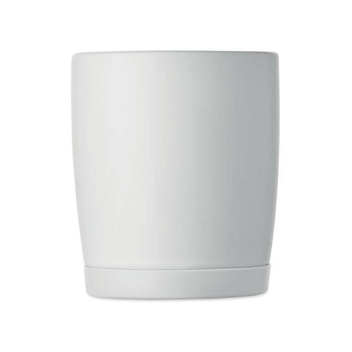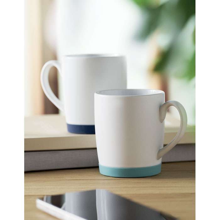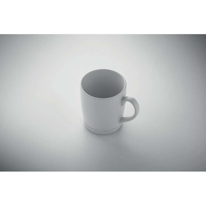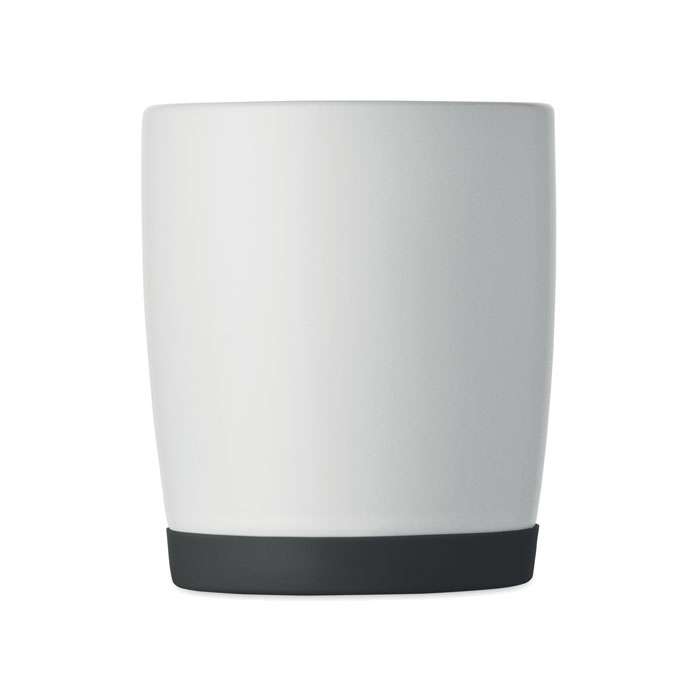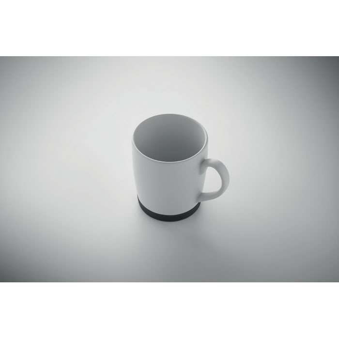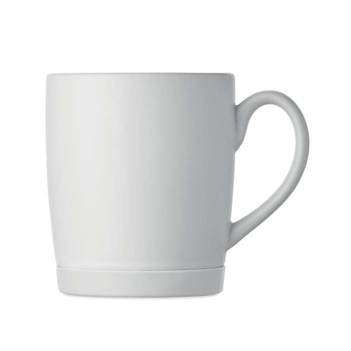 Keramisk mugg med vit matt yta och silikonbotten för stabilitet. Volym 300 ml. Individuell förpackning i vit kartong.