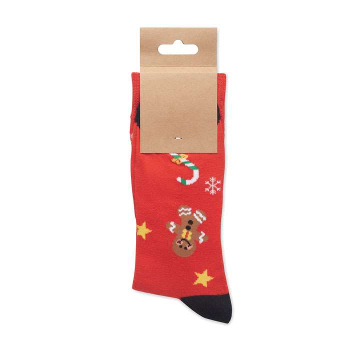 Julstrumpor i 75% bomull, 23% RPET-polyester och 2% spandex. Storlek M = 38-42.