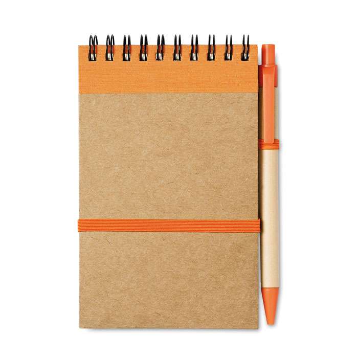 Anteckningsblock i fickformat med 70 blanka sidor i återvunnet papper. Tillhörande penna är återvunnen med biologiskt nedbrytbar plastdelar (53%). Blått bläck. FSC®-certified | FSC MIX, P7.1, FSC-C213206