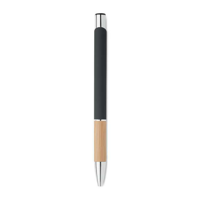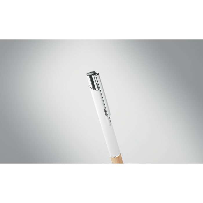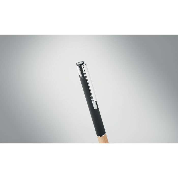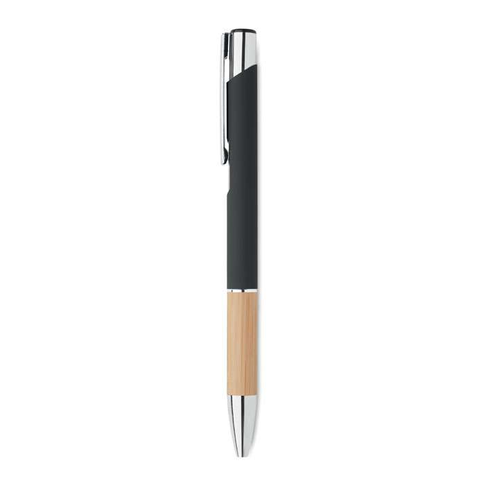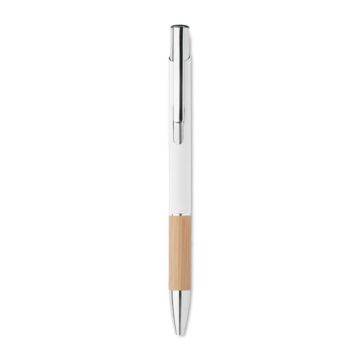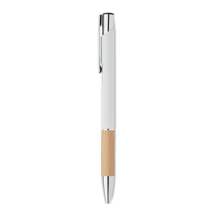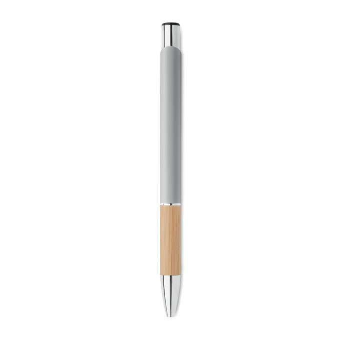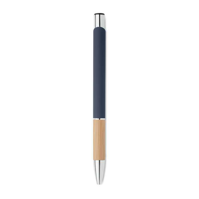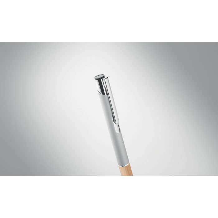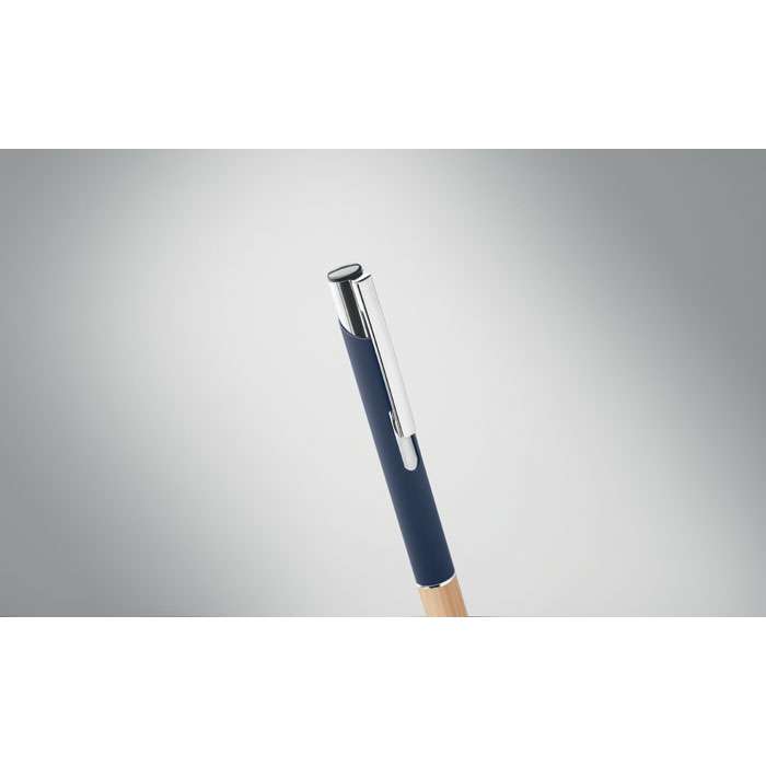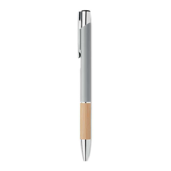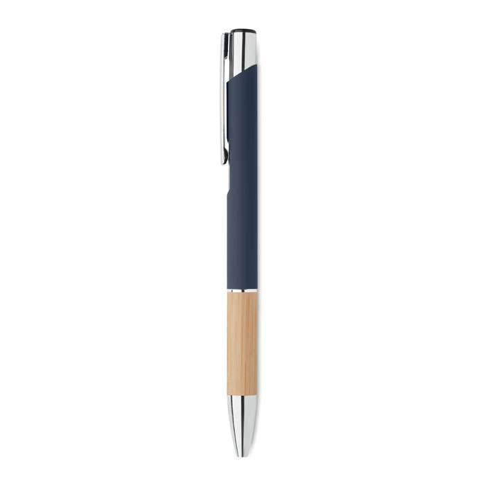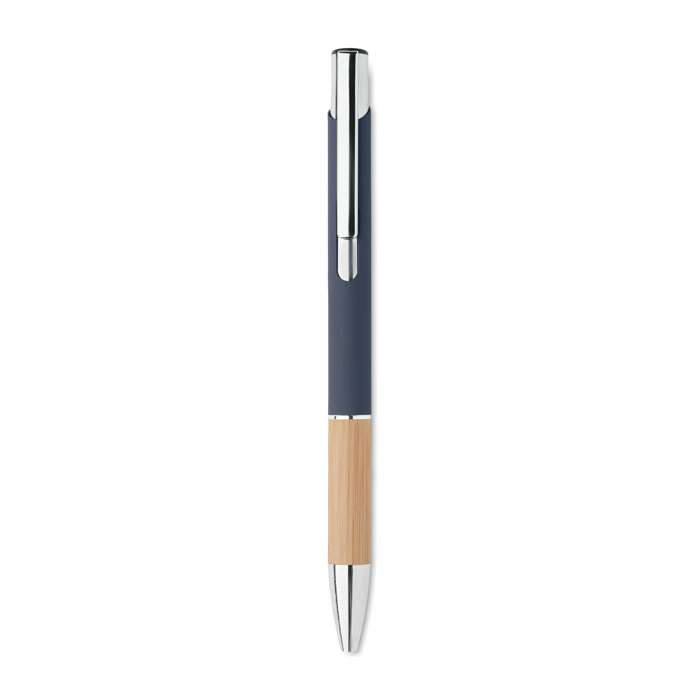 Tryckknappspenna i aluminium med bambugrepp. Blått bläck.