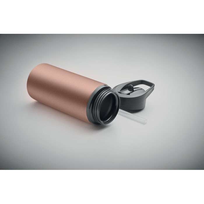 Flaska av återvunnet rostfritt stål (90% återvunnet rostfritt stål och 10% rostfritt stål) med enkel vägg, vikbart munstycke, sugrör och lock med bärhandtag. Volym: 500 ml. Silikongreppet ger dig ett bra grepp och skyddar dina händer från att bränna sig.