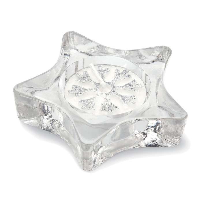 Stjärnformad värmeljusstake . Presenterad i silverfärgad presentask med transparent lock och dekorband. Glitterdekorerat värmeljus ingår.