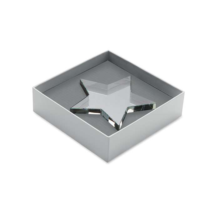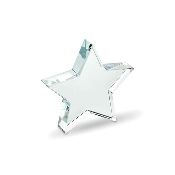 Stjärnpris eller trofé i glas. Presenteras i en presentförpackning.