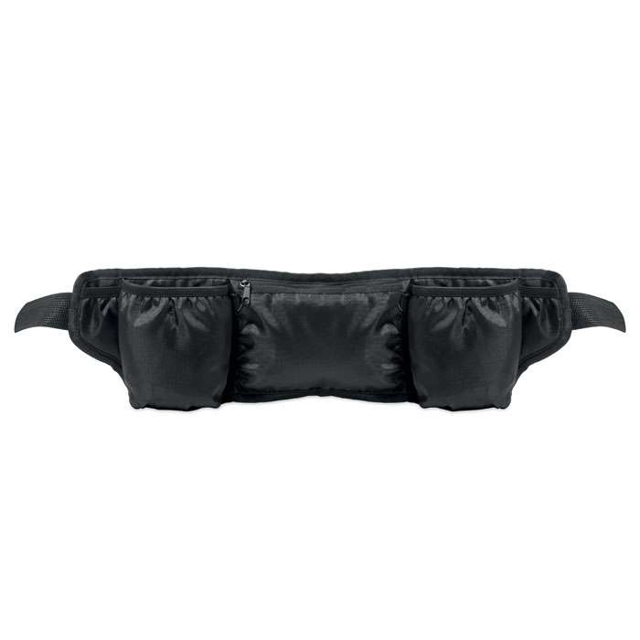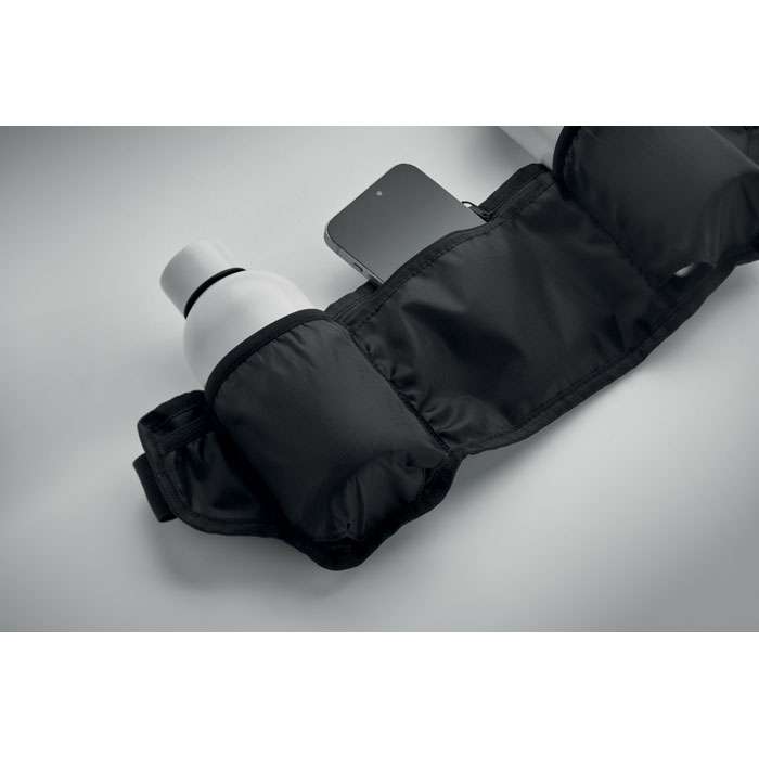 Midjeväska för löpning och vandring tillverkad av 420D RPET-polyester med meshrygg. Två flaskfack, central ficka med dragkedja och justerbar rem. Lätt och slitstark.