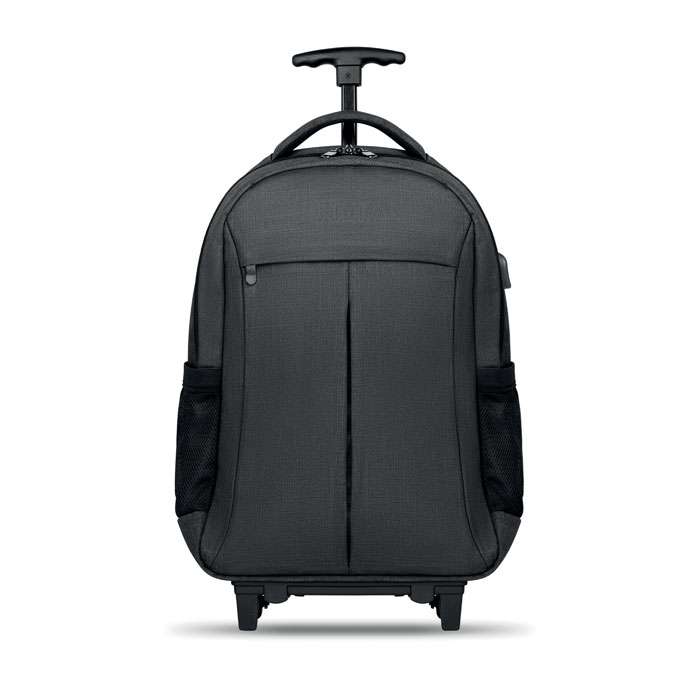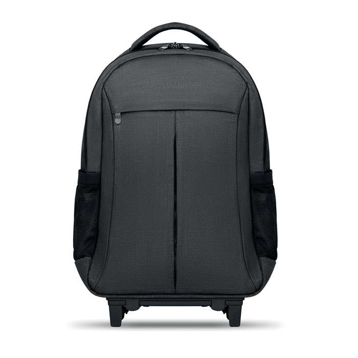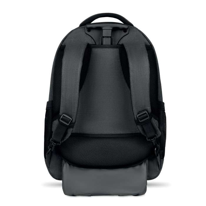 Ryggsäck med trolley-hjul i 360D polyester. Innehåller ett fack för 15 tums bärbar dator och en framficka med dragkedja. Vadderat i ryggen och på axelremmarna. Det finns även ett fack för ev. surfplatta. Har även ett skydd för hjulen när den bärs på ryggen för att undvika att smutsa ner kläderna.