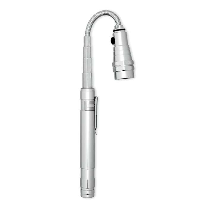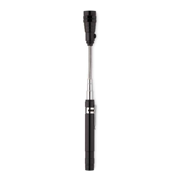 Teleskop ficklampa med 3 st LED-ljus och magnet på toppen och clips på sidan. 4 Batterier LR44 ingår. Maxlängd 57 cm.