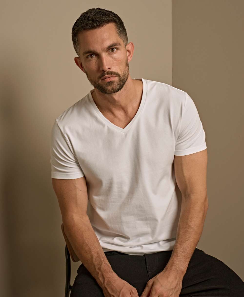 Den V-ringade versionen av vår slimmade t-shirt med stretch. Utrustad med en smal ribbad halsringning med elastan samt axel-till-axel-tejpning för ökad stabilitet. Den kammade bomulls- och elastanblandningen ger perfekt stretch och flexibilitet.