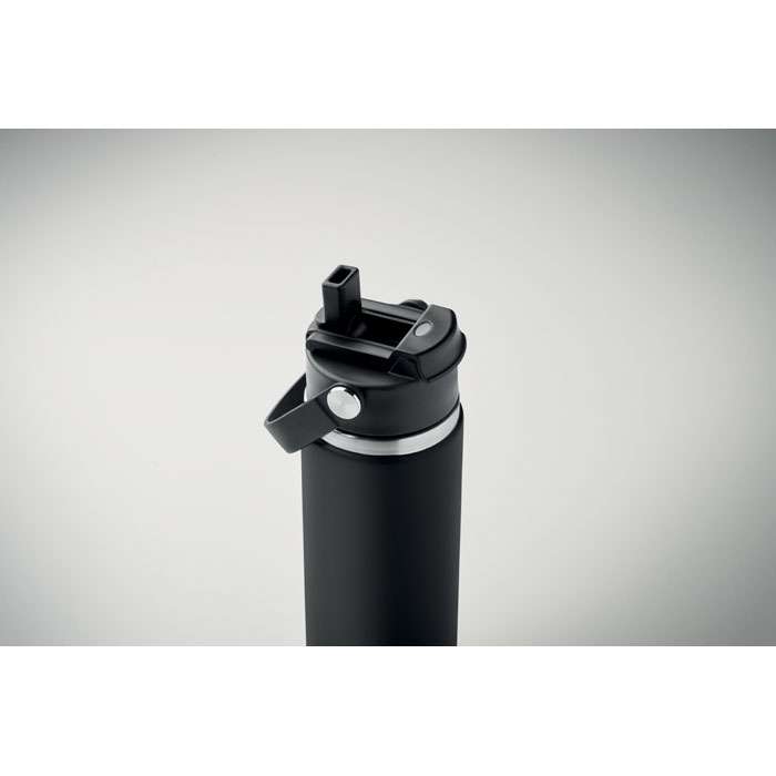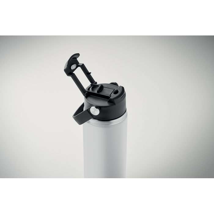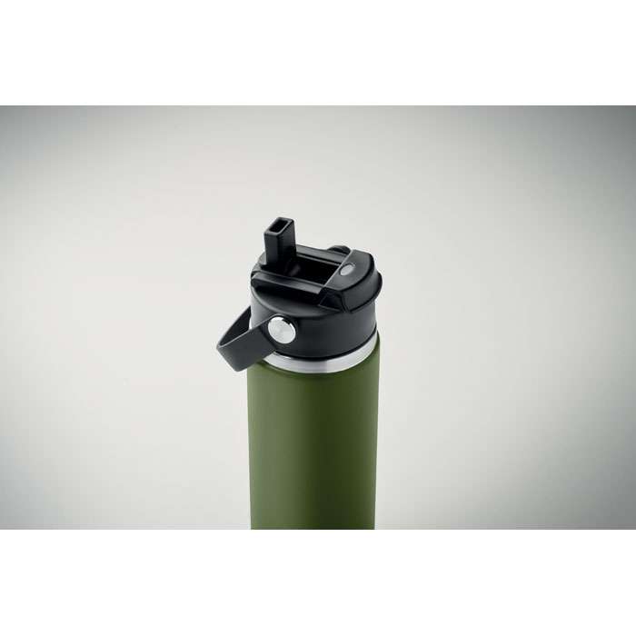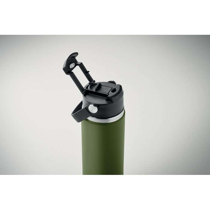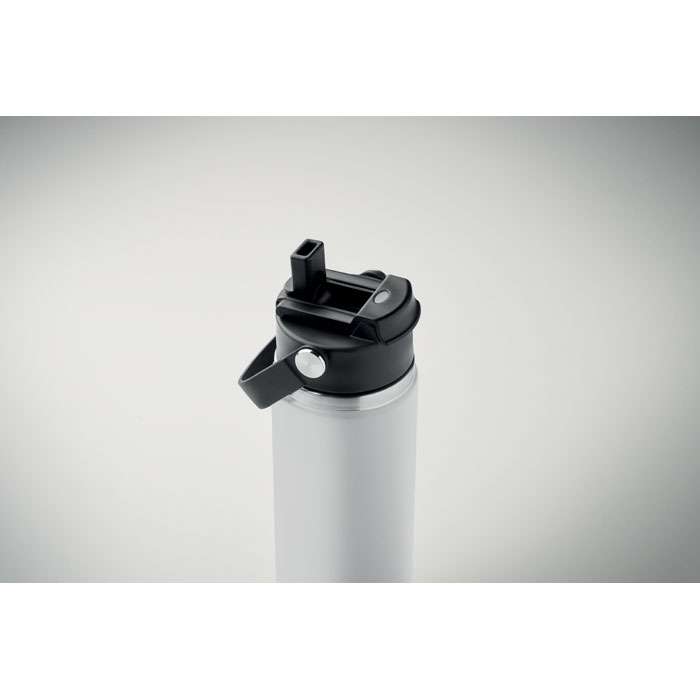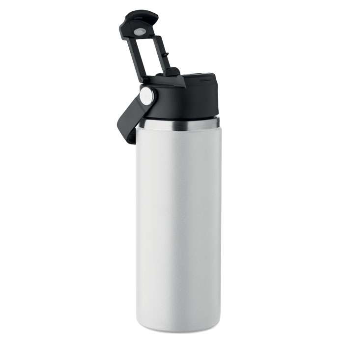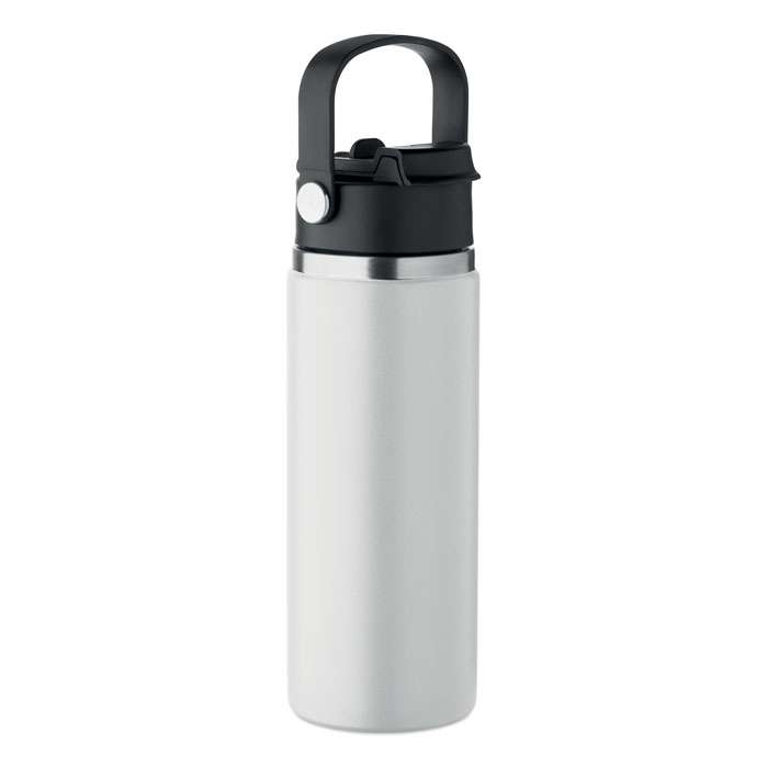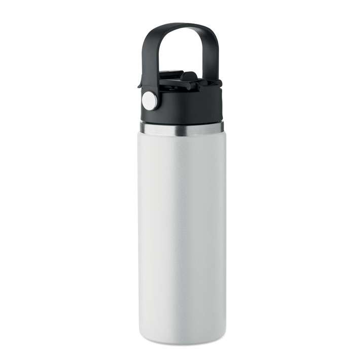 Dubbelväggig isolerad flaska i återvunnet rostfritt stål (90% återvunnet rostfritt stål och 10% rostfritt stål) med kombinerat sugrör och piplock med handtag. Läckagefri. Volym : 500 ml.