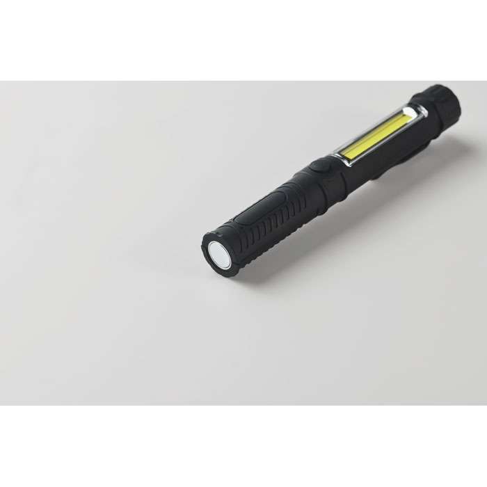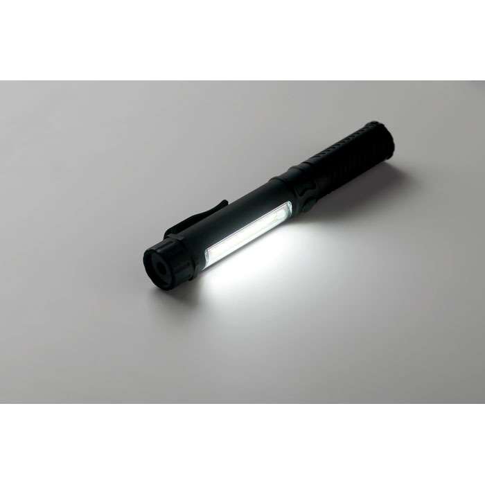 Magnetisk LED-arbetslampa i ABS med clips och COB-lampa på sidan. Magnetisk bas för handsfree-användning. Kräver 3 AAA-batterier (ingår ej).