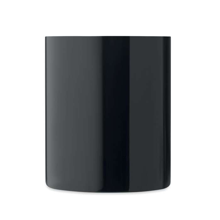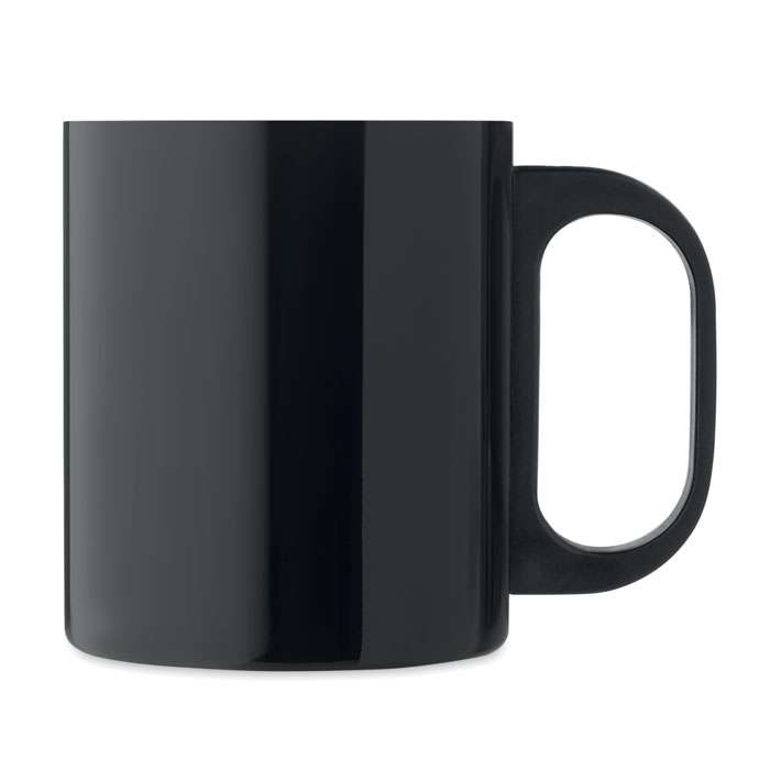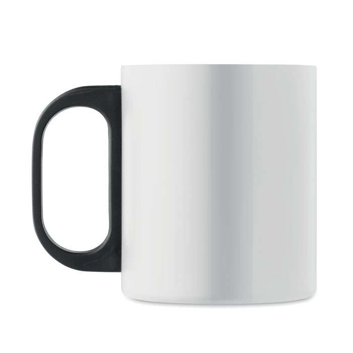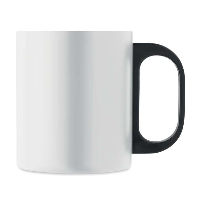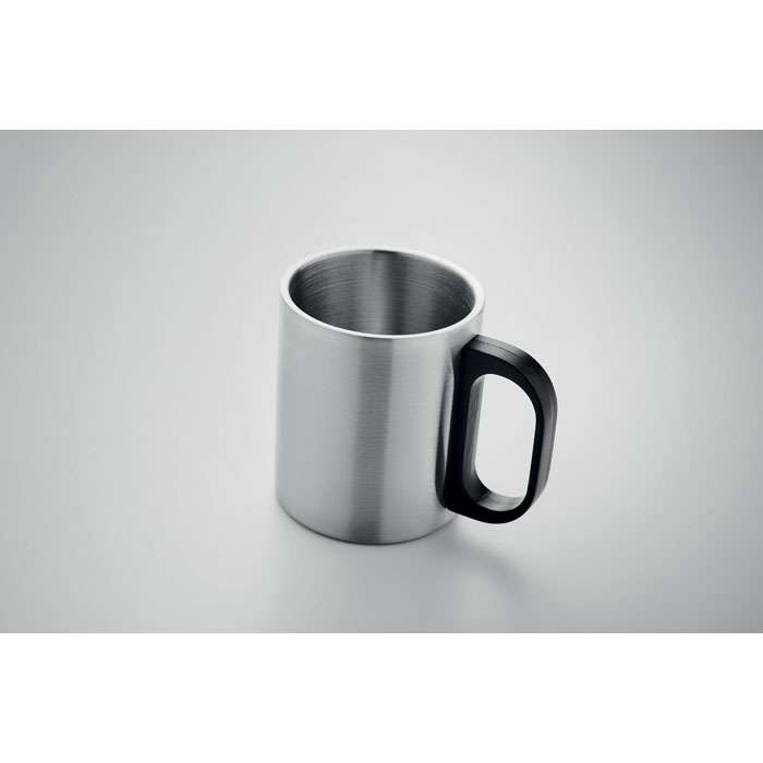 Dubbelväggig mugg i rostfritt stål med PP-handtag. Kapacitet: 300 ml.