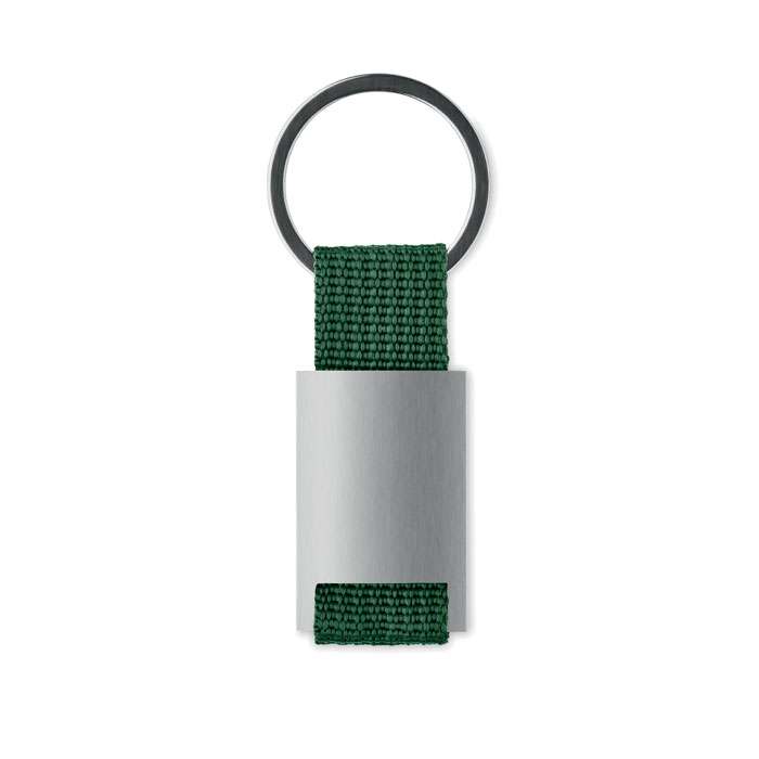 Rektangulär nyckelring i metall och färgat polyesterväv.
