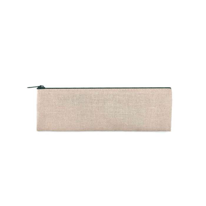 Kontorsset i 6 delar. Inkluderar en jute/bomulls påse, bambu linjal, pennvässare i trä, suddgummi, papperspenna och kulspetspenna, blått bläck.