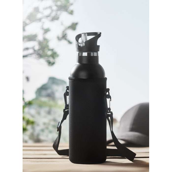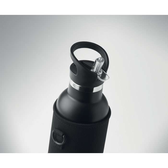 Isolerad termoflaska i rostfritt stål för både varma och kalla drycker. Levereras med dubbla skruvlock. Ett bambulock och ett extra lock med sugpip. Neoprenfodral med axelrem. Volym: 700 ml. Handdiskas.