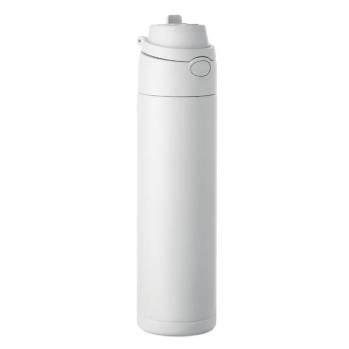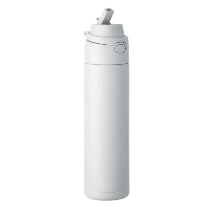 Enkelväggig flaska i återvunnet rostfritt stål (90% återvunnet rostfritt stål och 10% rostfritt stål). Med 2-i-1 sugrör och PP-lock med handtag. Läckagefri. Volym: 650 ml.