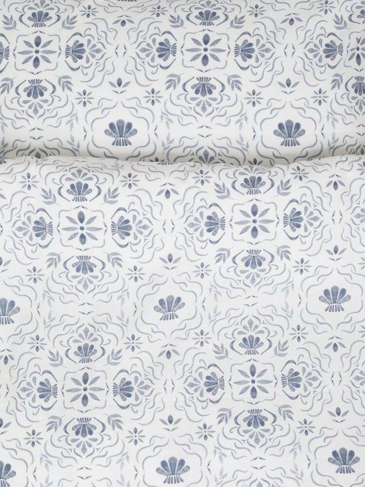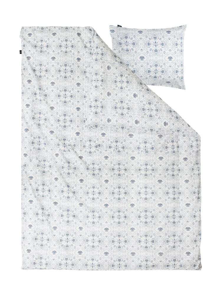 Bäddset i skön bomull med damaskinspirerat mönster i somrigt skiftande blå eller gröna nyanser på vit botten.