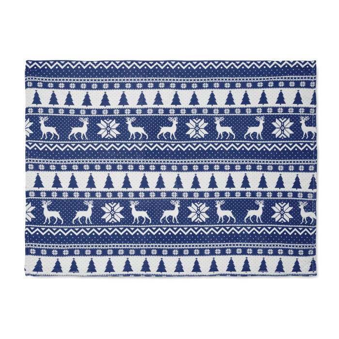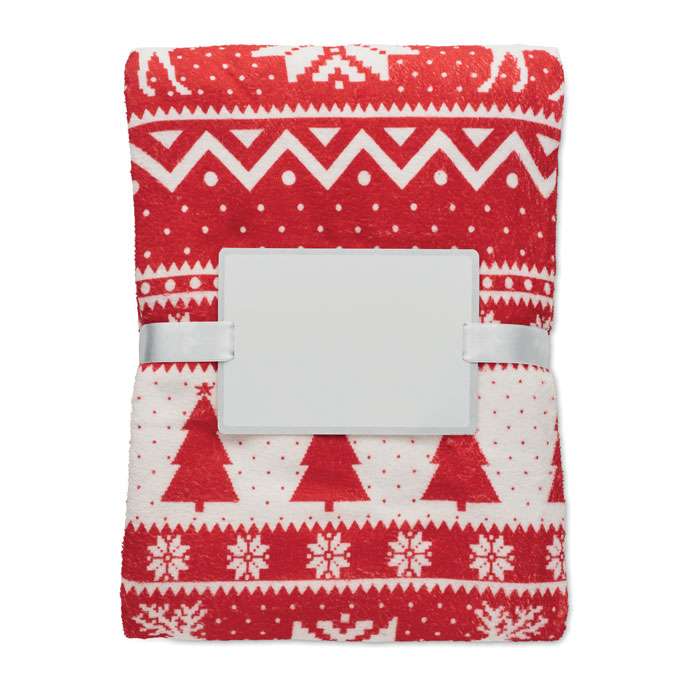 190 gr/m² RPET coral fleece filt med vintermönster. Inslagen i band och tryckbart kort.