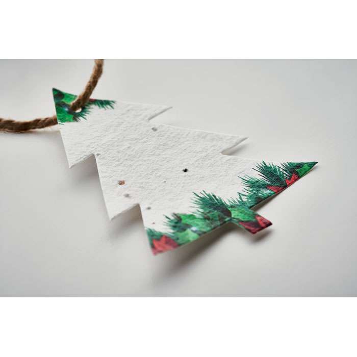 Mjukt fröpapper med fröblandning av vildblommor i form av ett julgransprydnadsträd med jutesnöre. Efter användning kan du plantera pappret och se det växa till en äng med vilda blommor. Tillverkad i EU.