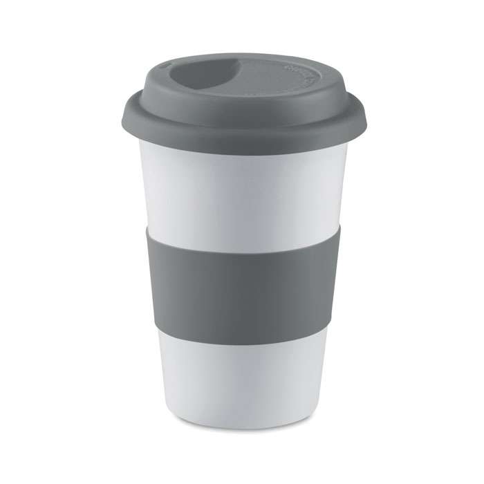 Keramik mugg med silikon lock och grepp för att skydda handen mot värmen. Innehåll 400 ml. Tampotryck tål inte diskmaskin. Keramik transfer tål diskmaskin.