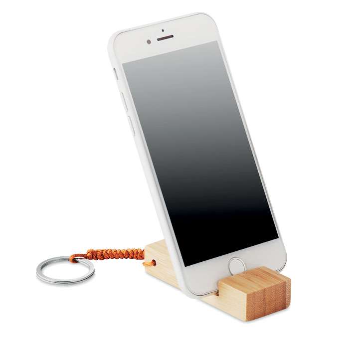 Nyckelring med telefonställ i bambu. Då bambu är ett naturligt material kan vissa färgskiftningar förekomma.
