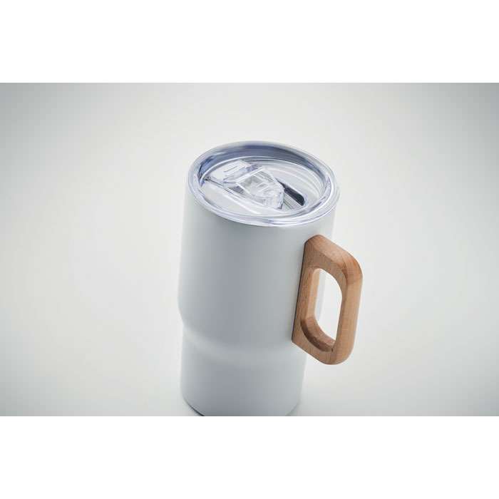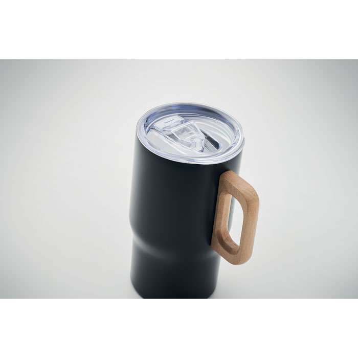 Dubbelväggig mugg i återvunnet rostfritt stål (90% återvunnet rostfritt stål och 10% rostfritt stål) med trähandtag och lock. Volym: 350 ml.