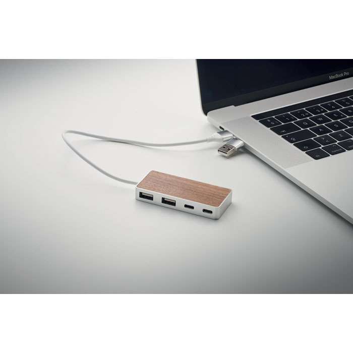 USB-hubb med 4 portar i fodral av återvunnen aluminium och detalj i valnöt. Utgång: 2 x typ-A och 2 x typ-C. Ingång: 2-i-1 Typ-C och Typ-A. Kabellängd: 27,5 cm.