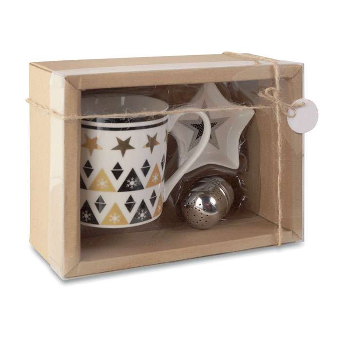 Keramik mugg, teasil och underlägg i fin presentförpackning med transparent lock och matchande presentsnöre och en etikett för en personlig hälsning.