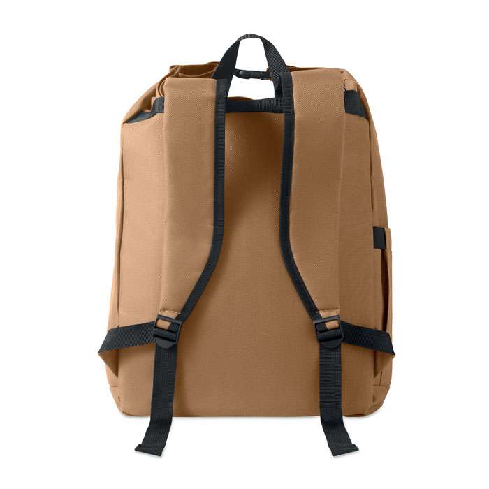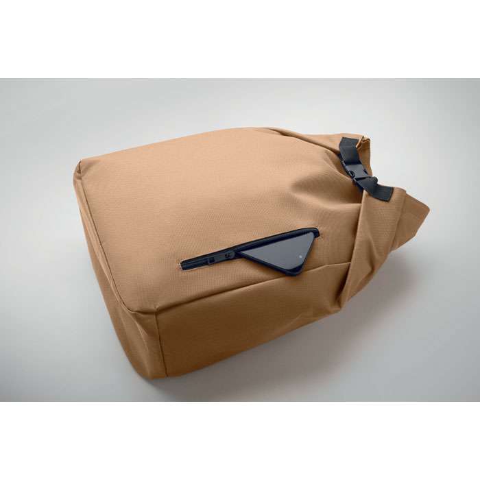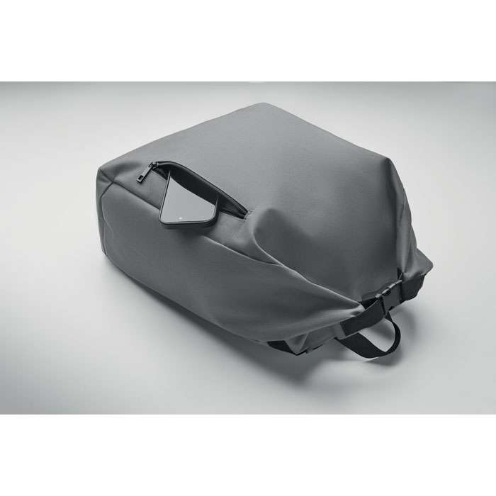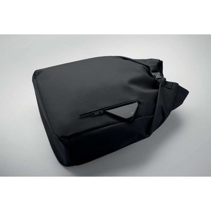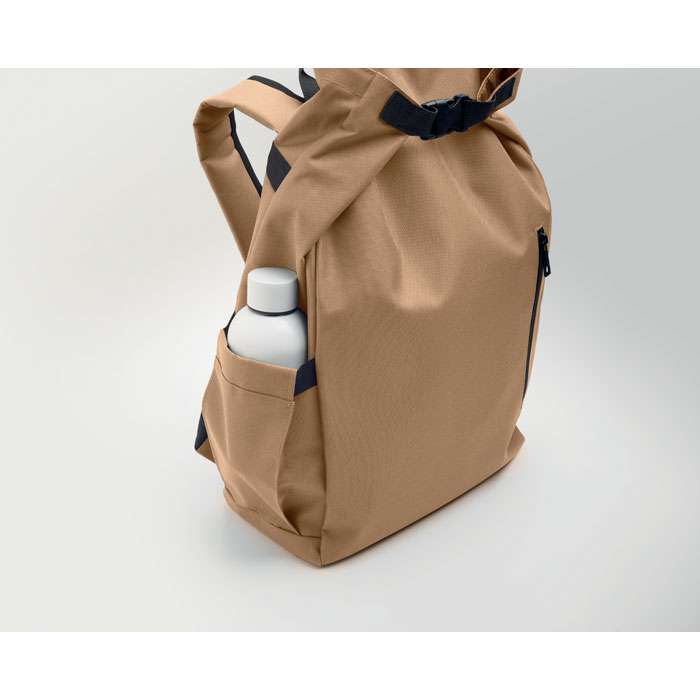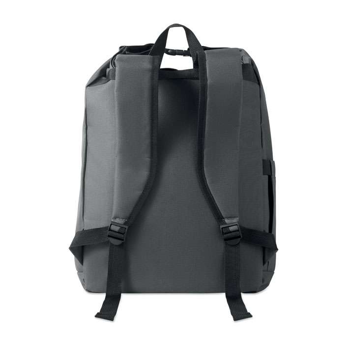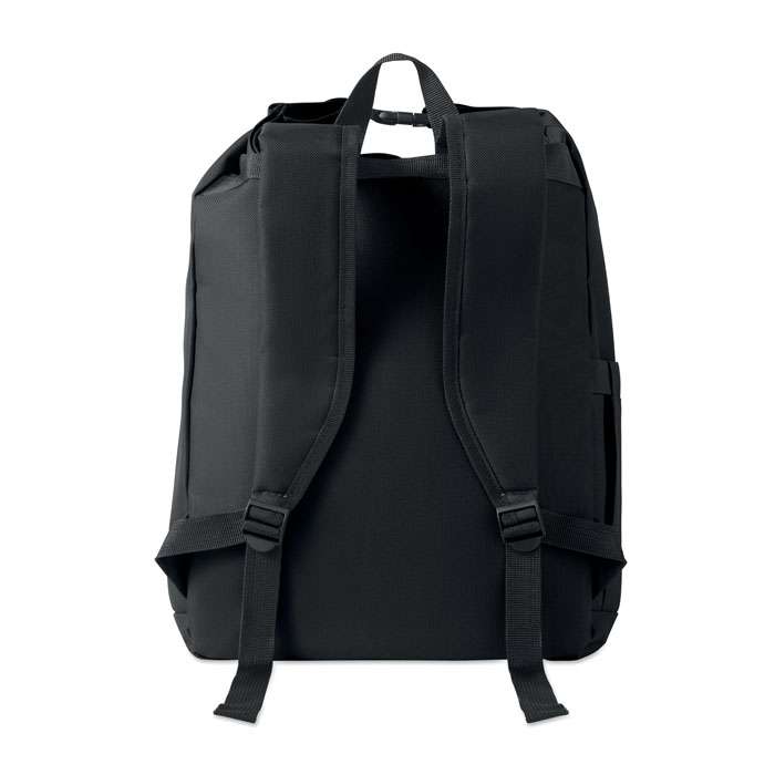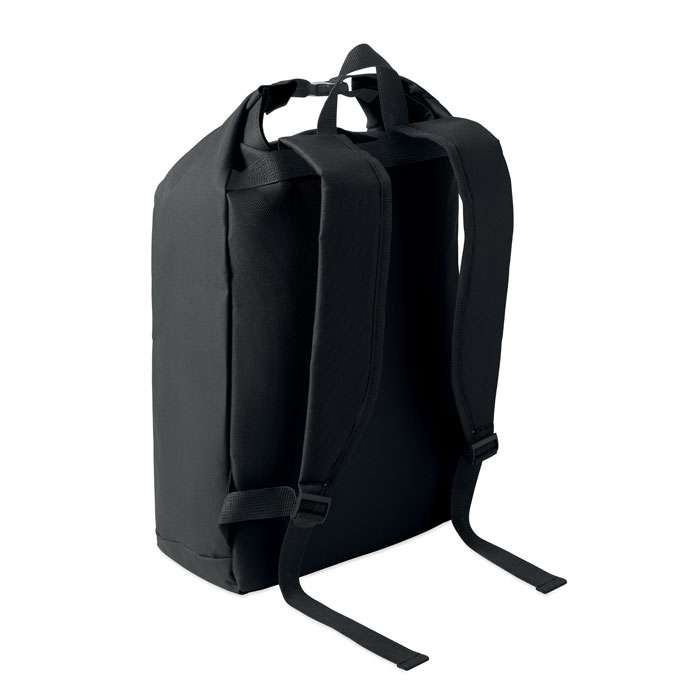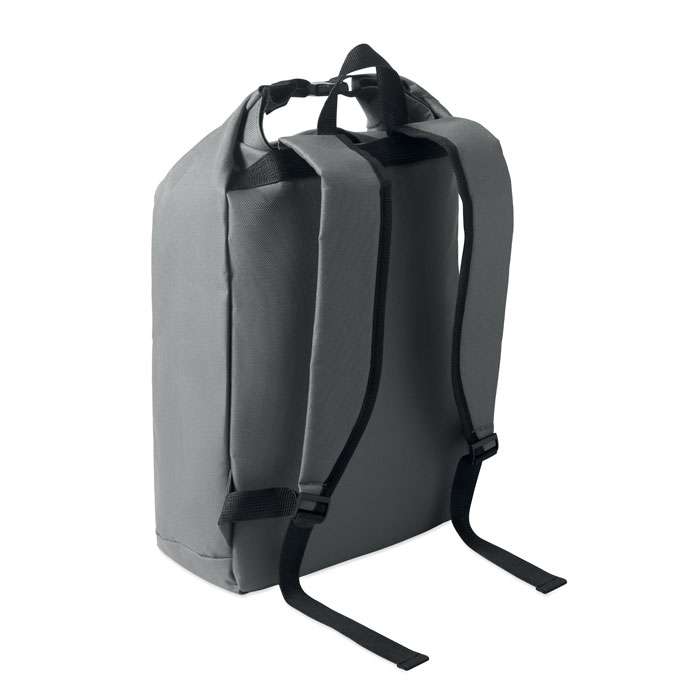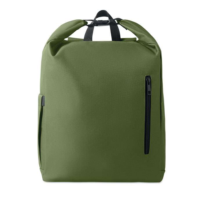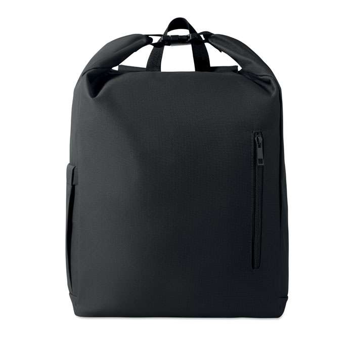 15-tums laptopryggsäck med rulltopp stägning tillverkad av 600D RPET-polyester med 210D RPET-vadderat foder. Frontficka med dragkedja, elastisk sidoficka och justerbara axelremmar.