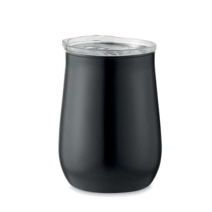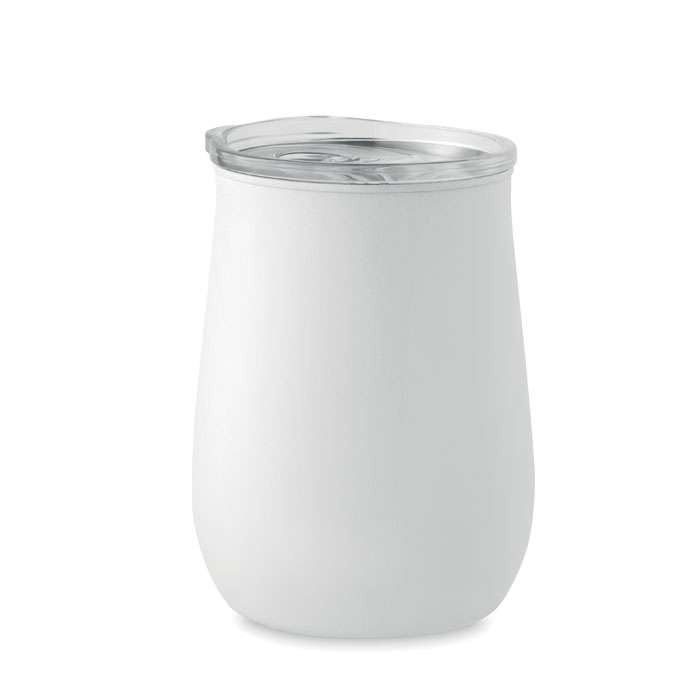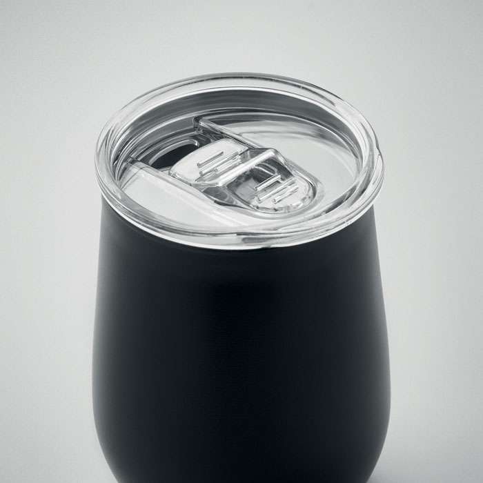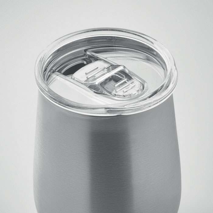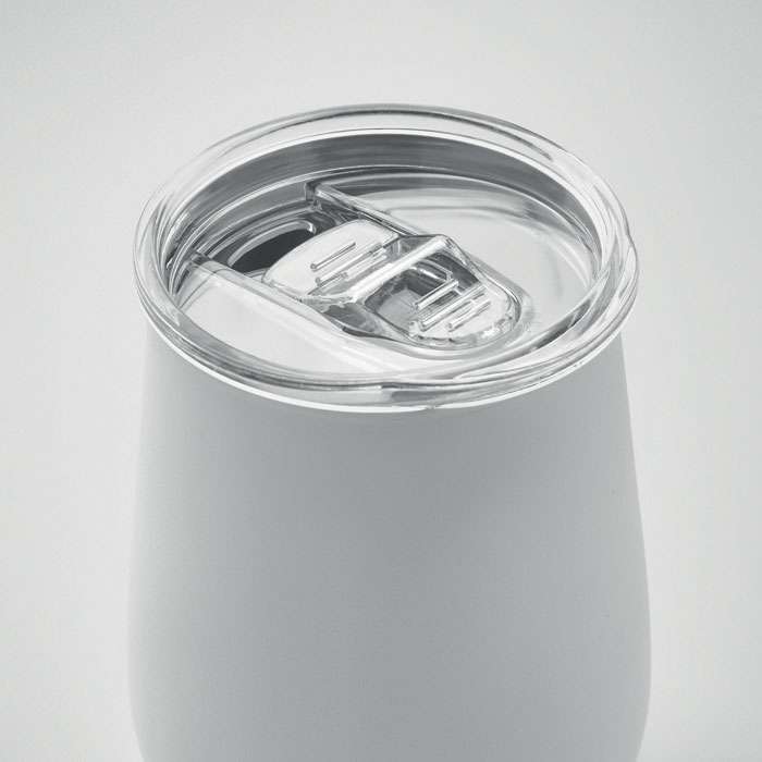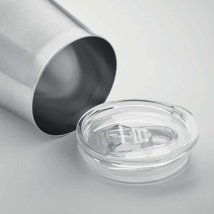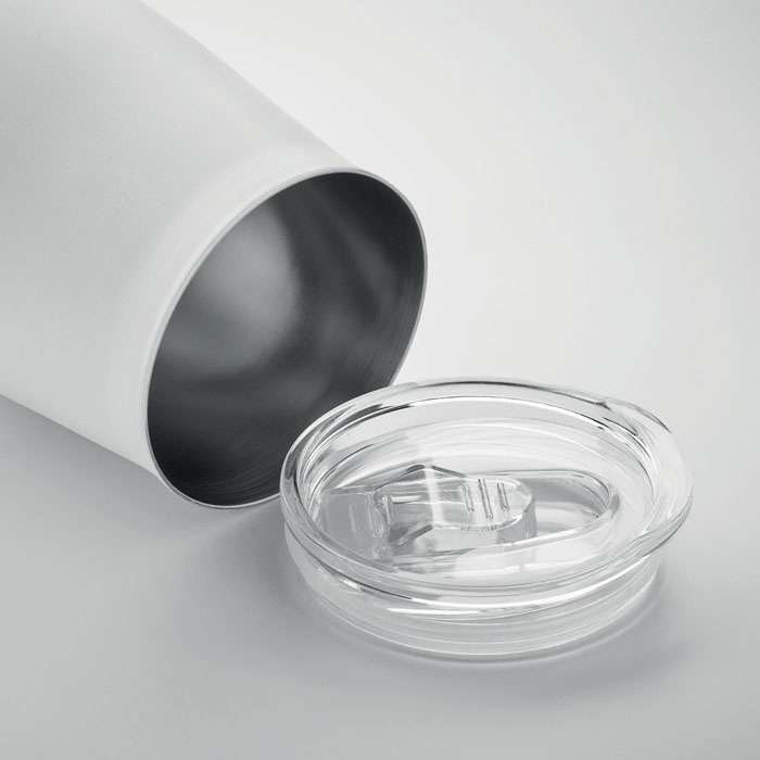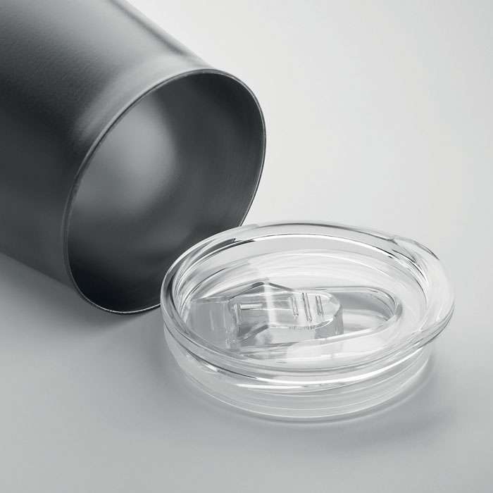 Återvunnet rostfritt stål (90 % återvunnet rostfritt och stål 10 % rostfritt stål) pulverlackerad mugg med lock med glidande dragkedjehål. Kapacitet: 500 ml.